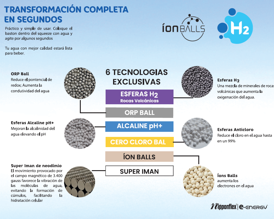 Descubre el compañero de bienestar definitivo: el innovador dispositivo ION BALLS, ahora disponible con una elegante y práctica botella flexible tipo Squeeze con mineralizador incorporado.